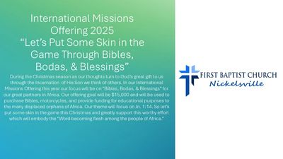 Our Internatonal Missions Offering for 2025 is: Let's Put Some Skin in the Game - Through Bibles, Boda Bodas, & Blessings. During the Christmas season as our thoughts turn to God's gift to us through the Incarnation of His Son we think of others. In our International Missions Offering this year our focus is on providing bibles, motorcyles, and educational scholarships to assist the people of Africa. Let's make the Word become flesh through the support of our Christmas offering that will be used to provide bibles, transportation for pastors who are walking long distances to preach the gospel, and educational assistance for orphaned children so they might receive an education.